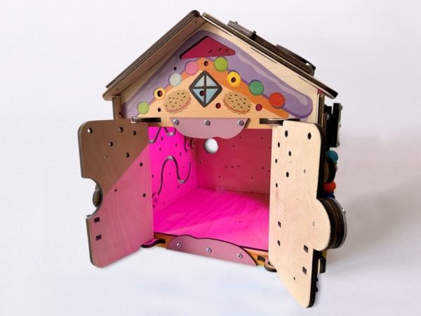 Vrata prekrivena glazurom: Prednja strana kućice skriva vrata koja vode u čarobnu unutrašnjost. Različiti mehanizmi zatvaranja i otvaranja pomažu djeci u razvoju praktičnih vještina, a sama vrata treniraju finu motoriku, koordinaciju i logičko razmišljanje. Kada se vrata otvore, plišani prijatelji mogu useliti u svoj slatki dom!